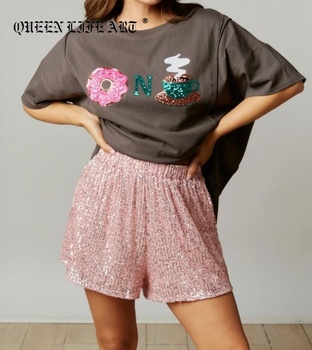 महिलाओं के लिए ग्रीष्मकालीन सफेद टी-शर्ट ग्लिटर दिल के आकार के अनुक्रमों को महिलाओं के लिए नई ट्रेंडी ऑफ-कंधे के साथ फैशन सेक्सी टी-शर्ट