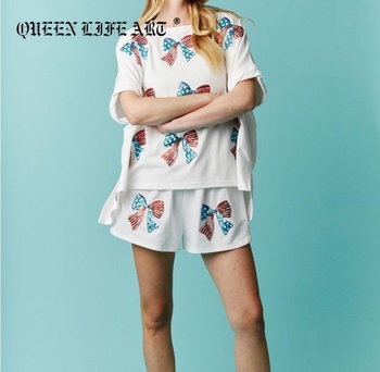 Tùy Chỉnh Thân Thiện Với Môi T-Shirt Với Lỏng Lẻo Phù Hợp Với 3D Sequin Thêu Sọc Chắp Vá In Long Lanh Sequins 'Tik Tok' Thiết Kế